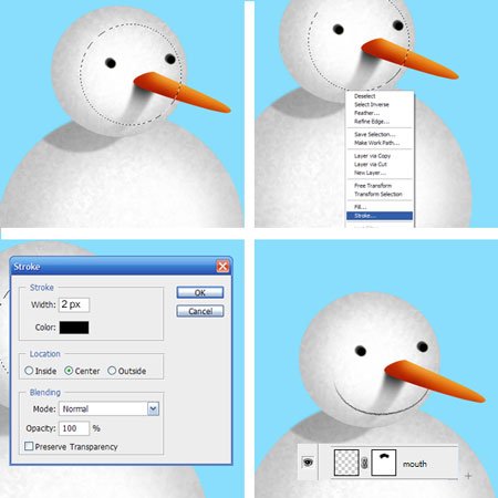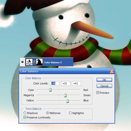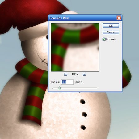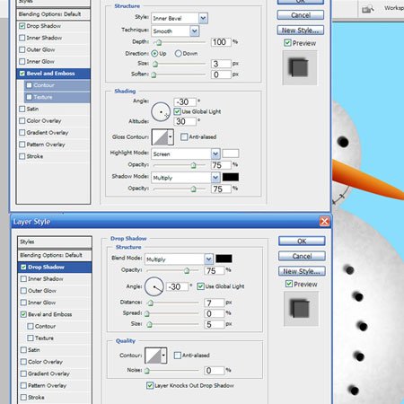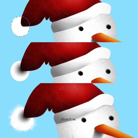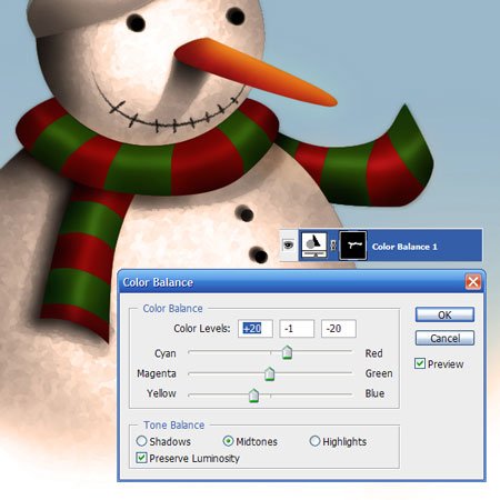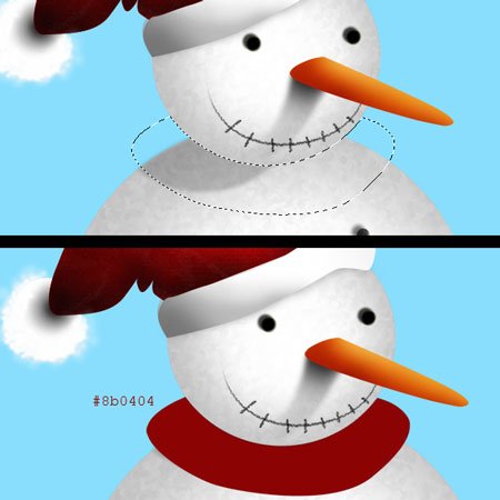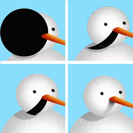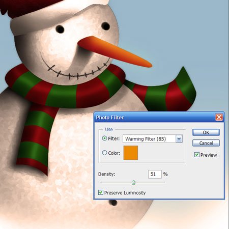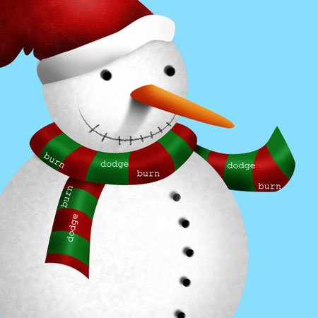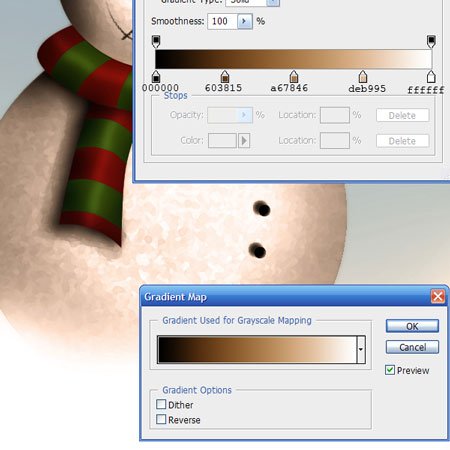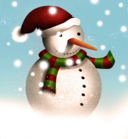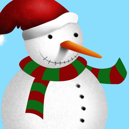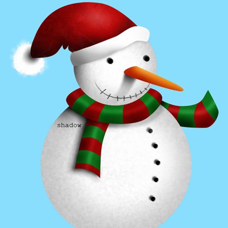 ![]() Шаг 2.Создаем новый слой. Выбираем Ellipse Tool ![]() Шаг 3.Создаем новый слой под слоями с окружностями. Берем Brush Tool Теперь переходим на слой с телом снеговика, зажимаем CTRL и кликаем по слою, чтобы загрузить его выделение, затем переходим на слой с тенью и CTRL+J. Слой с серой окружностью, который мы использовали, больше нам не нужен, поэтому его можно удалить. Далее переходим Filter - Blur - Gaussian Blur (Фильтр - Размытие - Размытие по Гауссу) и устанавливаем значение на 3-4%. В результате мы создали тень для головы. ![]() Шаг 4.Переходим на слой с телом и загружаем его выделение. Активируем Gradient Tool ![]() Шаг 5.В этом шаге мы будем создавать текстуру для снеговика. Активируем Brush Tool Other Dynamics (Другая динамика) - 100%, 0%. Теперь маленькой кистью рисуем текстуру, интенсивно работаем по краям и совсем немного в центре. Устанавливаем режим смешивания слоя на Multiply (Умножение) и Opacity (Непрозрачность) примерно на 35-40%. ![]() ![]() Шаг 6.Активируем Brush Tool (Кисть) (B) с жесткими краями без тех настроек, которые мы делали в предыдущем шаге, и рисуем два черных глаза. Переходим к Layer - Layer Style (Слой - Стиль слоя) и применяем такие параметры: ![]() ![]() ![]() Шаг 7. С помощью Pen Tool ![]() Шаг 8.В этом шаге мы нарисуем тень от носа снеговика. Берем круглую Кисть (B) черного цвета с жесткими краями и рисуем окружность, как на изображении ниже, затем жмем CTRL+J. Создаем слой маску для этого слоя (кнопка Add layer mask (Добавить слой-маску) находится внизу панели слоев). Если тень слишком темная, уменьшаем уровень Opacity (Непрозрачность). ![]() Шаг 9. Теперь создадим рот. Активируем Ellipse Tool ![]() ![]() Шаг 10.С помощью Pen Tool ![]() Шаг 11.Теперь мы должны создать шапку на новом слое с помощьюPen Tool (Перо) (P). Заливаем форму красным цветом #a90505. Располагаем этот слой под слоем с отворотом. Располагаем загруженную ранее текстуру над слоем с шапкой. Устанавливаем режим смешивания наLuminosity (Свечение) и Opacity (Непрозрачность) примерно на 20-25%. ![]() ![]() Шаг 12.Добавляем эффекта глубины с помощью Burn Tool ![]() Шаг 13.Теперь нарисуем пуговицы. Используем ту же технику, что и для глаз. Активируем Brush Tool (Кисть) (B) с жесткими краями и рисуем несколько маленьких окружностей. Делаем коррекцию с помощью Layer - Layer Style (Слой - Стиль слоя), как на изображении ниже. ![]() Шаг 14.Активируем Ellipse Tool (Эллипс) (U) и рисуем небольшую окружность под слоем с шапкой. Заливаем ее белым цветом и создаем тень. Теперь берем кисть (B) с параметрами из Шага 5 и рисуем белый мех. ![]() Шаг 15.В этой части мы будем создавать шарф. Создаем базовую форму с помощью Pen Tool (Перо) (P), как на изображении ниже. Заливаем ее красным цветом #8b0404. ![]() ![]() Пером создаем полосы и заливаем их зеленым цветом #0b6a16. Используем Burn Tool ![]() ![]() Создаем новый слой под шарфом и кистью (B) добавляем теней. ![]() Шаг 16.Кистью добавим снега. ![]() Шаг 17.Это длинный шаг, так как сейчас мы будем создавать корректирующие слои, чтобы снеговик не выглядел как иконка на рабочем столе. Добавляем Layer - New Adjustment Layer - Curves (Изображение - Коррекция - Кривые) ![]() Переходим Filter - Filter Gallery - Watercolor (Фильтр - Галерея фильтров - Акварель) и устанавливаем параметры, как на изображении ниже. Opacity (Непрозрачность) примерно 30%. ![]() Layer - New Adjustment Layer - Photo Filter (Слой - Новый корректирующий слой - Фотофильтр) и выбираем Warming Filter 50% (Согревающий фильтр 50%). ![]() Корректирующий слой Color Balance (Цветовой баланс) - +20, -1, -29. ![]() Корректирующий слой Gradient Map (Карта градиента). ![]() Filter - Blur - Gaussian Blur (Фильтр - Размытие - Размытие 