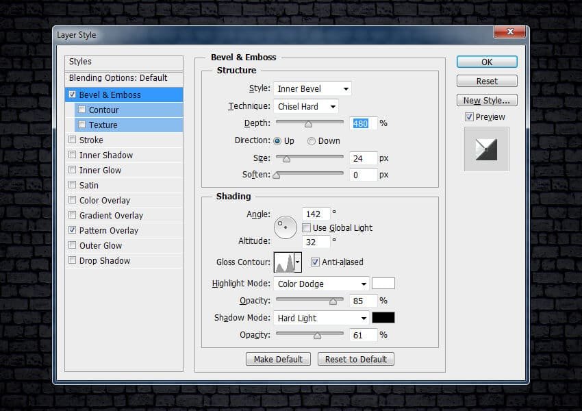 1. Создаём Задний фонОткройте исходное изображение с кирпичной стеной в программе Photoshop. Мы используем данное изображение в качестве заднего фона для нашей сцены, поэтому, размеры нашего рабочего документа будут 850 х 600 рх. Для этого идём Меню - Файл - Открыть (Menu > File > Open) и в появившемся окне, выберите исходное изображение с кирпичной стеной.. ![]() 2. Создаём Металлический Средневековый ТекстДанный текстовый эффект создан на одном слое, поэтому, когда вы завершите создание эффекта, вы можете сохранить его в качестве нового стиля в своей библиотеке Стилей для использования в будущих работах. Шаг 1Выберите инструмент Горизонтальный текст (Type Tool), установите шрифт Cardinal. Установите Размер Шрифта (Font Size) на 354 pt. Напишите слово Kalio в центре холста. ![]() Шаг 2Убедитесь, что вы находитесь на слое с текстом, далее, щёлкните правой кнопкой мыши по слою с текстом и в появившемся окне, выберите опцию Параметры наложения (Blending Options). Выберите стиль слоя Наложение узора (Pattern Overlay). Установите следующие настройки для данного стиля слоя: