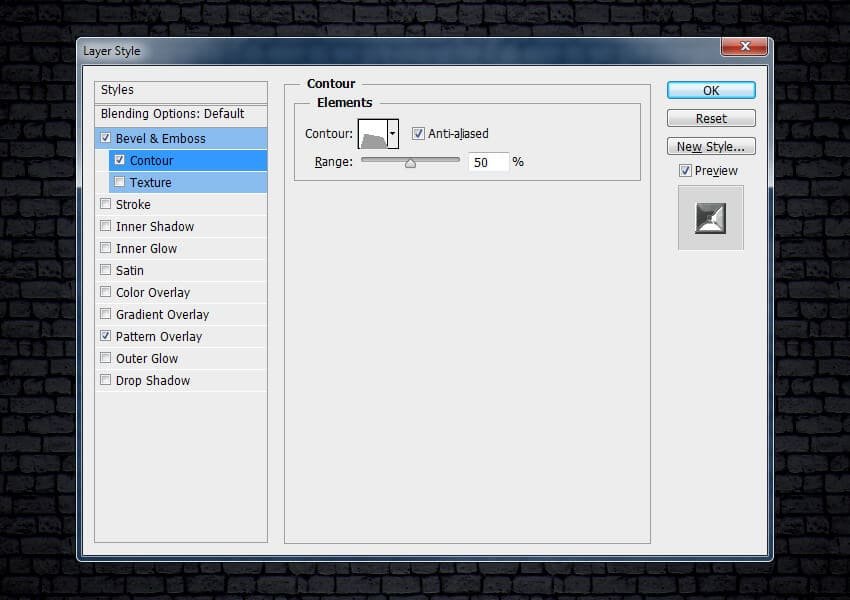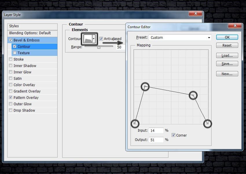 ![]() Шаг 5Выберите стиль слоя Контур (Contour). Установите следующие настройки для данного стиля слоя: