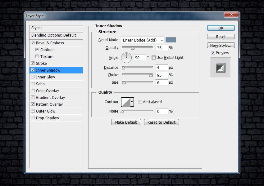 ![]() Шаг 8Выберите стиль слоя Внутренняя тень (Inner Shadow). Установите следующие настройки для данного стиля слоя: