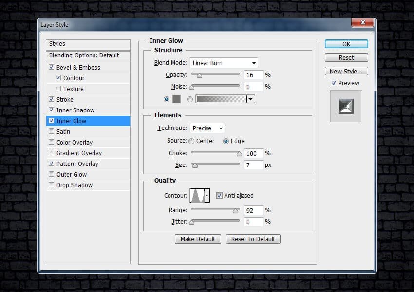 ![]() Шаг 9Выберите стиль слоя Внутреннее свечение (Inner Glow). Установите следующие настройки для данного стиля слоя: