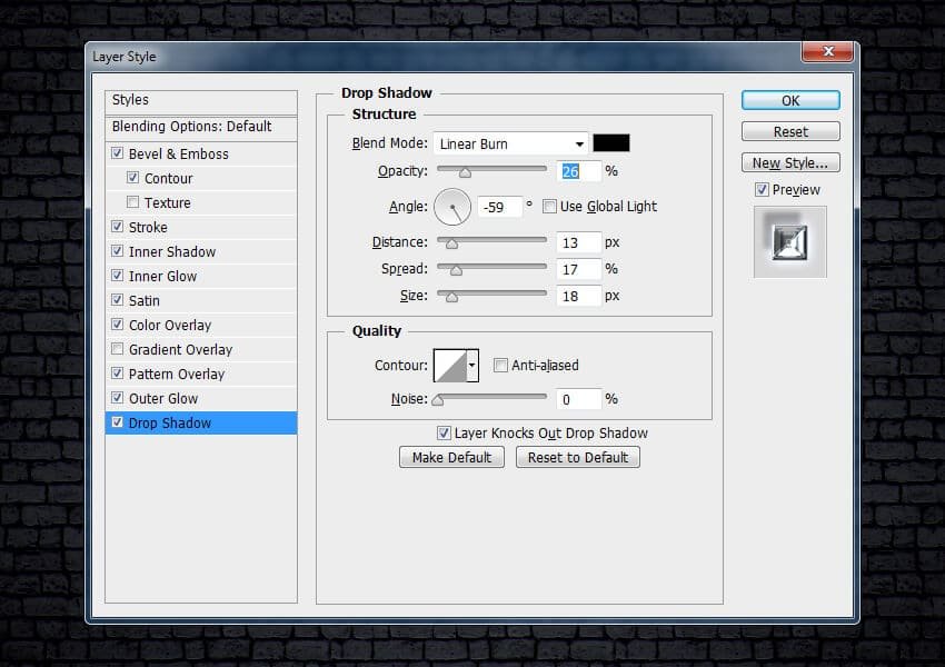 ![]() Шаг 14В качестве заключительного шага, добавьте стиль слоя Тень (Drop Shadow). Установите следующие настройки для данного стиля слоя: