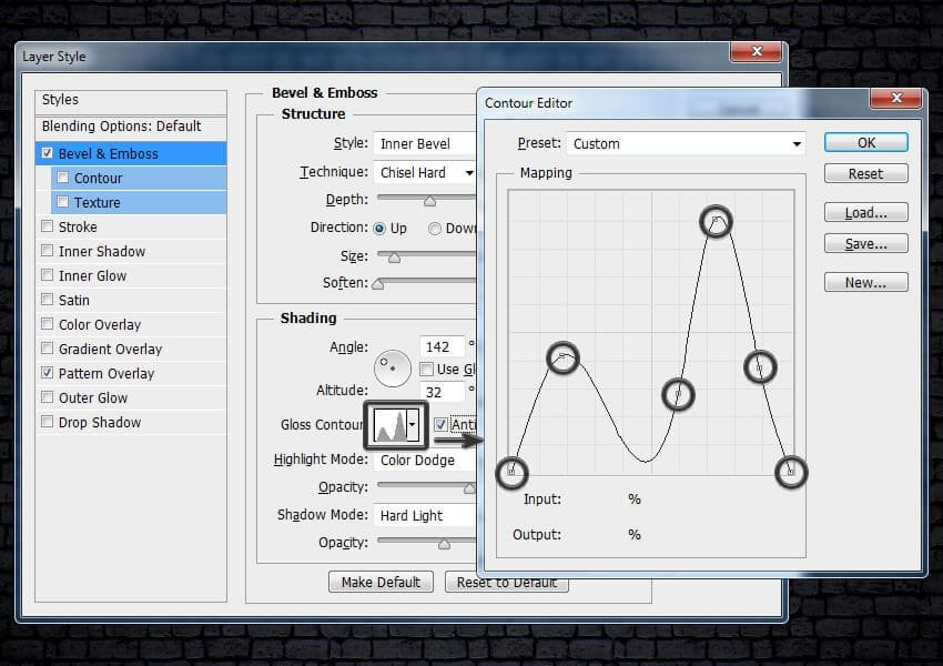 ![]() Шаг 4Так как мы всё ещё находимся в окне настроек стиля слоя Тиснение (Bevel & Emboss), давайте создадим Контур глянца (Gloss Contour) со следующими настройками, которые указаны на скриншоте ниже:Добавьте шесть контрольных точек вдоль контура кривой. Чтобы добавить точки, щёлкните где-нибудь на кривой. Теперь введите значения Входа (Input) и Выхода (Output) для каждой контрольной точки.