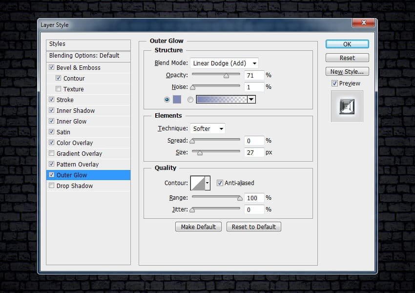 ![]() Шаг 13Выберите стиль слоя Внешнее свечение (Outer Glow). Установите следующие настройки для данного стиля слоя: