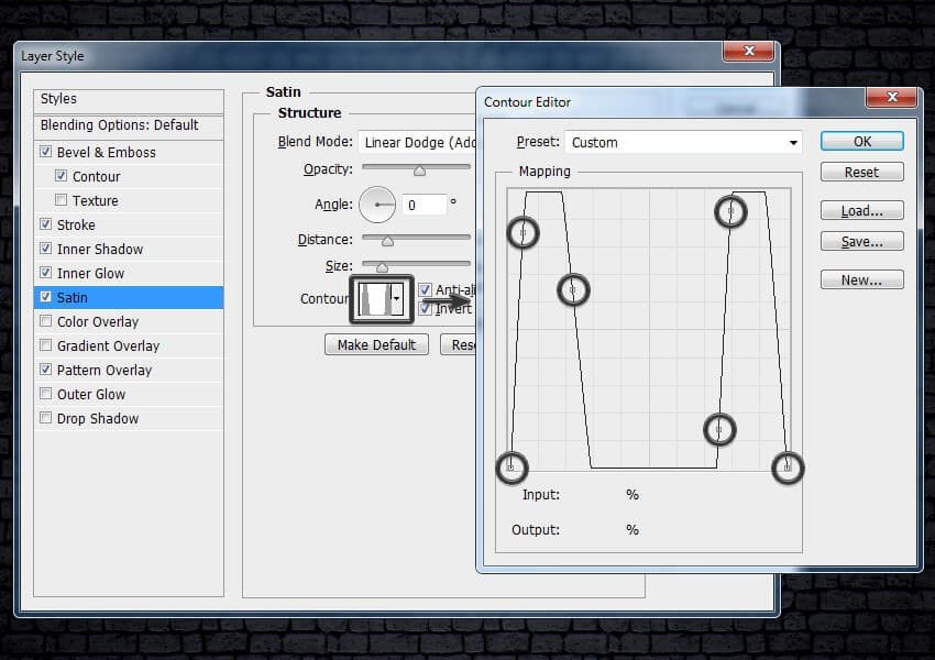 ![]() Шаг 11Так как мы всё ещё находимся в окне настроек стиля слоя Глянец (Satin), давайте создадим Контур глянца (Gloss Contour) со следующими настройками, которые указаны на скриншоте ниже:Добавьте шесть контрольных точек вдоль контура кривой. Чтобы добавить точки, щёлкните где-нибудь на кривой. Теперь введите значения Входа (Input) и Выхода (Output) для каждой контрольной точки.
