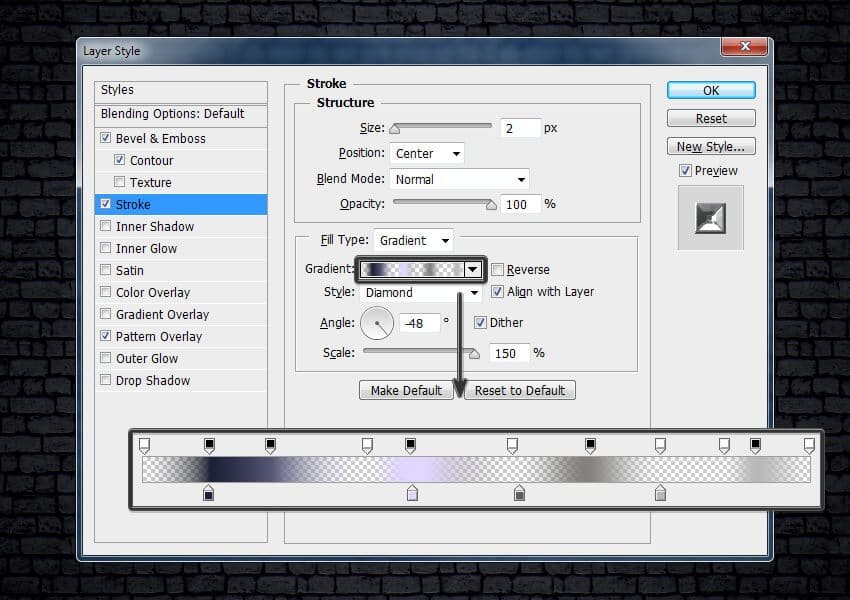 ![]() Шаг 7Выберите стиль слоя Обводка (Stroke). Установите следующие настройки для данного стиля слоя: