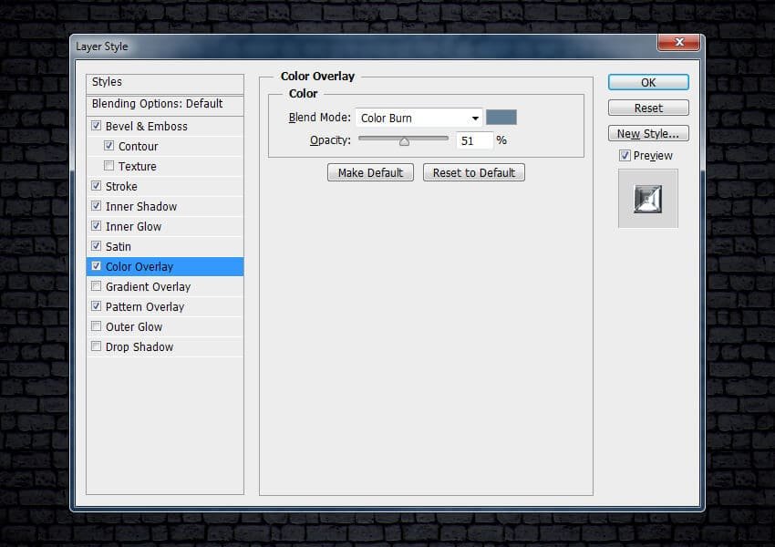 ![]() Шаг 12Выберите стиль слоя Наложение цвета (Color Overlay). Установите следующие настройки для данного стиля слоя: