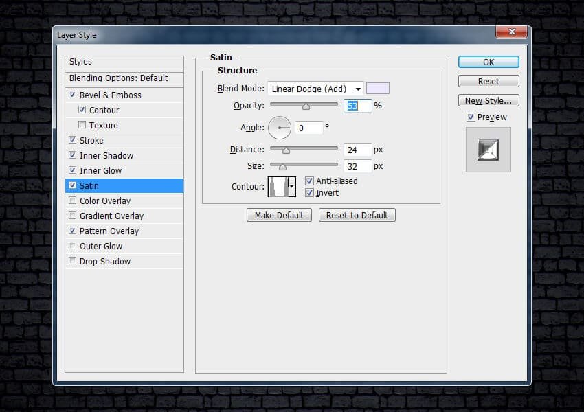 ![]() Шаг 10Выберите стиль слоя Глянец (Satin). Установите следующие настройки для данного стиля слоя:
